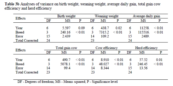 There was no evidence against normality for all the variables. Therefore, the results can be considered as representative of the populations. The evidence for significant differences between years occurred only for weaning weight and average daily gain (Table 3a, b). However, the assumption was made that this effect would be equally applicable to all the breeds.