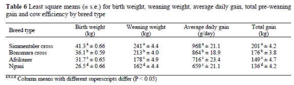 Breed had a significant effect on the birth weight, adjusted weaning weights and total gain of the calves (Table 6). These weights were directly linked to the frame sizes of the dams, with the larger animals having the heavier calves. The calves from the larger framed SX cows gained more than 100 g/day than the BX (P < 0.05). The latter gained more than 150 g/day than the AF. Although the average daily gain of the AF and NG did not differ (P > 0.05), the significantly higher birth weight of the former resulted in the AF having a heavier (P < 0.05) adjusted weaning weight.