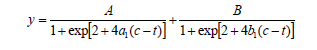 where y is the total gas volume (mL) at time t, A and B the gas volume (mL) from fast (soluble sugars and starch) and slowly (cellulose and hemicellulose) degradable fractions, respectively, a1 and b1 are the degradation rates (per h) for fast and slowly degradable fractions, respectively, and c is the time taken (h) for bacteria colonization or lag time (lt).