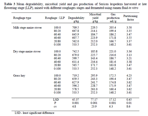 In a recent review of the in vitro gas production (GP) technique, Dijkstra et al. (2005) pointed out that many workers have observed the relationship between degradability predicted from GP using fixed time points and in vivo degradability to be only moderate, and that this relationship was improved substantially by including parameters related to the dynamism of GP (e.g. Chenost et al., 2001; Carro et al., 2002). Blümmel & Bullerdick (1997) suggested complementation of in vitro GP with residue determination in evaluation of the nutritive value of feeds. In this approach, the residue determination reveals how much substrate is degradable and the gas measurement reflects how much of the degraded portion is converted into fermentation acids and gases. The ratio of substrate truly degraded to gas volume produced, defined as 'partitioning factor' (PF) was found to be valuable in predicting voluntary feed intake. The present study used the in vitro gas GP technique to investigate the nutritive effects caused by supplementing locally available roughages in South Africa with lespedeza.