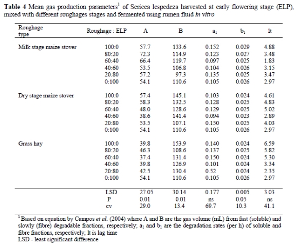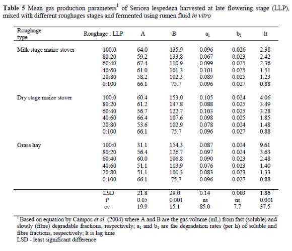 Feed resources are a major component of economic animal production. Their availability and efficiency of use in specific agro-ecological zones dictate to a very large extent the performance of the livestock production system. During the dry season ruminants in tropical and sub-tropical regions mostly survive on low quality roughage such as standing hay or crop residues, leading to poor performance. Maize is a widely grown cereal and is staple food in most African smallholder systems. It is largely grown and left in the fields to dry to over 80% grain dry matter (DM) before harvesting. Alternatively, maize is popularly harvested at milk stage for roasting, boiling or cooking with vegetables. The stover left after harvesting is potentially a major feed resource to boost ruminant production if properly utilized. However, maize stovers are low in protein or nitrogen (N) concentration (Fadel, 1999) necessitating supplementation with N-rich feed resources. Lucerne (Medicago sativa L.) is the predominant pasture legume that has been used as N source for many classes of livestock (Van Keuren & Matches, 1988). However, due to ecological limitations and high agronomic requirements, alternatives to lucerne are sought, of which Sericea lespedeza (lespedeza) has shown potential (Terrill et al., 1989). Lespedeza [Lespedeza cuneata (Dun-Cours) G. Don] is a tall growing, drought tolerant, coarse-stemmed, non-bloating, deep tap-rooted, self-seeding, perennial legume, adapted to a wide range of soils (Powell et al., 2003). It is widely planted in southern USA for grazing, hay and as a soil restoration and conservation crop (Powell et al., 2003). Although common lespedeza are known to have a high tannin content which may limit the nutritive value (Turner et al., 2005), ruminants such as goats have been reported to tolerate and perform well when consuming high tannin-containing plants (Silanikove et al., 1996). Other advantageous features of lespedeza include being long term forage once established (Barkley, 1986), provision of good quality grazing (Schmidt, 1982) and coping well under waterlogged conditions (Guernsey, 1970). In addition, South African farmers have described lespedeza as a low cost pasture, which provides good quality early spring and autumn grazing, makes good quality and 'cheap' hay, hay cures quickly, less wear-and-tear on mowing equipment, increases summer carrying capacity, seldom needs lime and/or phosphorus corrections at planting and does not require the use of pesticides. However, the farmers pointed out disadvantages of lespedeza as slow establishment and inability to be used as foggage ("standing hay") because it is frost sensitive (H. Botha, 2005, Personal communication, Harmonie Trust, P.O. Box 27, Matatiele 4730, South Africa). Lespedeza was imported to South Africa about 15 years ago and commercial seed is now available. Being a relatively new forage in African livestock systems, there is little information on the nutritive value of lespedeza rations with locally available roughages. To provide such information requires screening numerous dietary combinations; ideally through in vivo trials. However, in vivo trials are expensive and impractical to screen a large number of diets. In vitro methods are alternatively used, but the suitability of a chosen method is essential.