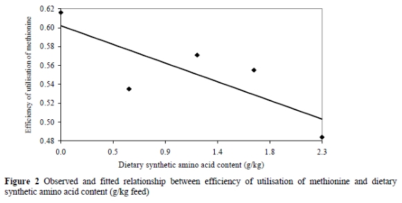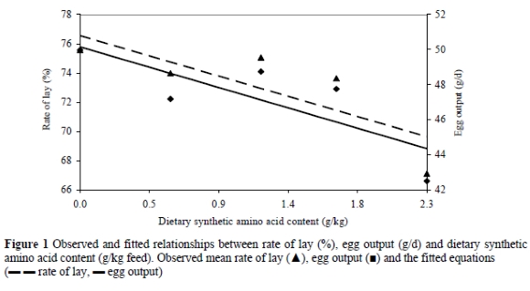 However, the relationships between rate of lay, egg output, emet and dietary synthetic amino acid content were linear (P < 0.01, P < 0.01 and P < 0.001, respectively), with rate of lay, egg output and emet decreasing by 3.0%, 2.5 g/d (Figure 1) and 4.3% (Figure 2) with each additional gram of free amino acid content/kg diet.