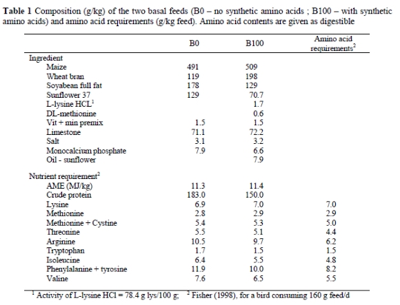 There have been many reports of a depression in growth or performance when low protein feeds, supplemented with amino acids to the same level as those in intact protein, are fed to poultry (e.g. Ferguson et al., 1998; Kerr & Kidd, 1999a; b; Waibel et al., 2000). One reason given for this is that one of the amino acids not normally considered in a feed formulation program may inadvertently be first-limiting in such a feed. To ensure that this was not the case here, all essential amino acids were considered when formulating feed B100, making use of the requirements specified by Fisher (1998), thus taking care that the amino acid balance in the two basal feeds was relatively constant. Of the non-test amino acids only tryptophan was not in excess of requirement. However, the small difference in tryptophan content between the two basal feeds suggests that it is unlikely that the large differences in response measured here could have been a response to tryptophan or indeed to any of the other non-test amino acids, especially as the same ingredients were used to supply these amino acids in both basal feeds.