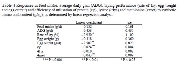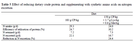 The replacement of lysine and methionine in intact protein with the synthetic form, up to 2.3 g/kg feed, had no effect on feed intake, bodyweight gain, egg weight or efficiency of lysine utilisation. The regression analysis of ep on dietary synthetic amino acid content showed that a significant (P < 0.001) linear relationship existed between the two: ep increased with increasing concentrations of synthetic amino acid, an extra gram of synthetic amino acid /kg diet resulting in an increase of 2.4% in ep. Moreover, increasing levels of synthetic amino acids reduced nitrogen excretion by 24.4% (Table 5). Supplements of 2.3 g/kg synthetic amino acids had a protein-sparing effect of 3.3 percentage units with a better utilisation of protein and a reduction in N excretion.