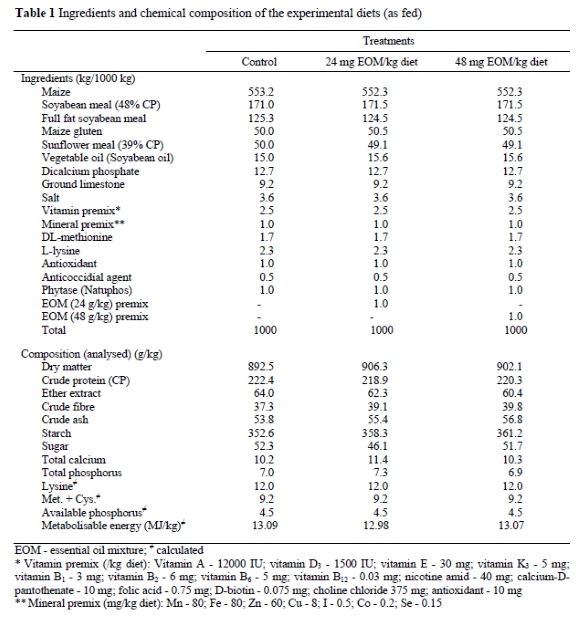 One thousand and eight unsexed day-old broiler chicks (Ross-308) originating from young (30 wks of age) and old (80 wks of age) breeder flocks were allocated randomly to three dietary treatment groups, viz. a control and the diet containing 24 or 48 mg/kg of an EOM. Each treatment consisted of eight replications with 42 birds per replicate. Each group contained 168 broilers from young and 168 broilers from old broiler breeder flocks. The commercial essential oil mixture™ (Herba Ltd. Co. İzmir-Turkey) consisted of six different essential oils derived from selected herbs growing in Turkey, viz. oregano oil (Origanum sp.), laurel leaf oil (Laurus nobilis L.), sage leaf oil (Salvia triloba L.), myrtle leaf oil (Myrtus communis), fennel seed oil (Foeniculum vulgare), citrus peel oil (Citrus sp). Hydrodistillation was used to extract the essential oils.