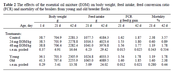 The aim of the present study was to examine the effects of a herbal essential oil mixture on the performance of broilers produced by a young (30 wk) or an old breeder (80 wk) flock. One thousand and eight unsexed day-old broiler chicks (Ross-308) originating from the two breeder flocks were randomly allocated to three treatment groups of 336 birds each. Dietary treatments were: a control and two diets containing 24 mg/kg or 48 mg/kg of an essential oil mixture. There were no significant effects of dietary treatment on body weight of the broilers at 21 and 42 days. The effect of the age of the parents did not have a significant effect on body weight of the broilers at 21 and 42 days of age. Up to 21 days the feed intake of broilers from young breeders was reduced significantly as a result of the inclusion of the essential oil mixture in their diets, and a significant improvement in feed conversion ratio was recorded in these birds. Difference in regression coefficients for feed intake and feed conversion ratio between broilers from young and old breeder flocks was significant. Carcass yield and some internal organ weights such as the liver, pancreas, proventriculus, gizzard and small intestine were not affected by the addition of the essential oil mixture to the diet. Inclusion of essential oil mixture to the diet decreased mortality significantly at 21 days.