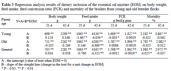 The data were analyzed using regression analysis to understand the effects of different levels of the essential oil mixture (EOM = 0, 24 and 48 mg/kg diet) on several traits. Firstly, simple regression analyses were carried out for broilers from young and old breeders separately and both broilers. Secondly, an analysis was applied to compare intercepts and regression coefficients obtained from two regression equations for the groups (young and old). To do this analysis, a dummy variable called "constdiff" that is coded 1 for old and 0 for broilers from young breeder flocks and another variable "slopediff" that is the product of "constdiff were created. Then "constdiff", EOM and "slopediff" effects were used as predictors in the regression equation. In the output of this final regression analysis, the constant indicates the intercept for broilers from young breeders; regression coefficients for "constdiff, EOM and "slopediff represent the difference between the intercepts for broilers from old and young breeders; slope for broilers from young breeders (omitted group) and the difference between the slopes for broilers from old and young breeders, respectively. Statistical analysis was undertaken using SPSS (Norusis, 1993).