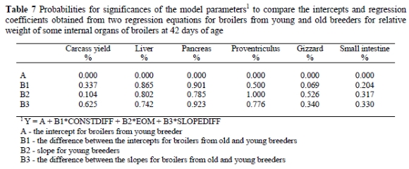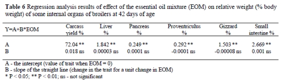 Relative weights of the carcass, liver, pancreas, proventriculus, gizzard and small intestine weight were not affected by dietary treatment (Table 5). Our findings are in agreement with the results of Hernandez et al. (2004) who found no differences in gizzard, liver and pancreas weights of broiler chickens fed diet containing an essential oil extract from oregano, cinnamon and pepper and a labiatae extract from sage, thyme and rosemary. Similar results were observed by Jamroz et al. (2005) who used essential oils in broiler diets based on maize and locally grown cereals. In contrast, Denli et al. (2004) indicated that inclusion of thyme and black seed essential oil increased intestinal weight and intestinal length in quail. There was no significant change in relative weights of carcass, liver, pancreas, proventriculus, gizzard or small intestine weight for increments in EOM (Table 6). Since this result is similar for broiler originating from young and old breeders, only overall results are presented in Table 6. Differences in regression model parameters between young and old broilers were also not significant (Table 7).