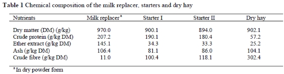 The milk replacer was diluted with warm water (about 50 °C) to contain about 12% dry matter (DM). It was cooled to 36-37 °C before being fed to the calves. Half the milk replacer was acidified by adding formic acid and pH of the AMR fell to about 4.8. The pH was continuously monitored. The replacer was offered once a day to calves at a level of 8% birth weight per day, using the water-milk bucket. The amount of replacer was kept constant until weaning at five weeks of age (Yanar et al., 1994). Two kinds of calf starters were used in the study. Starter I was fed from four days of age to four months of age, and Starter II to calves older than four months. The calves received two kg of these starters daily for the duration of the liquid feeding period, and were offered dry hay ad libitum during the whole trial (six months), as recommended by Ugur & Yanar (1998). Quantities of starters and dry hay remaining in the feeders were weighed back daily and amounts consumed were calculated and recorded. The DM (AOAC, 1990; method 934.01), crude protein as kjeldahl nitrogen (AOAC, 1995; method 990.03), ether extract (AOAC, 1990; method 920.39), ash (AOAC, 1990; method 9420.5) and crude fibre (Tyznik, 1992) levels in the diets were determined.