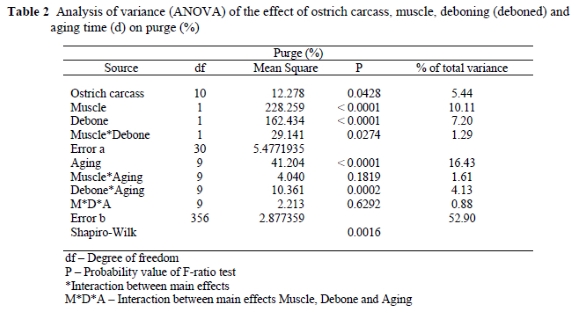 The analysis of variance (ANOVA) of percentage purge is presented in Table 2. Although there were significant two-way interactions between deboning and aging and between muscle and aging, the percentages of variation of respectively 4.13% and 1.29% caused by these interactions, were low compared to the percentages of variation caused by ostrich carcass (5.44%), muscle (10.11%), deboning (7.20%) and aging (16.43%); and therefore these are discussed further.