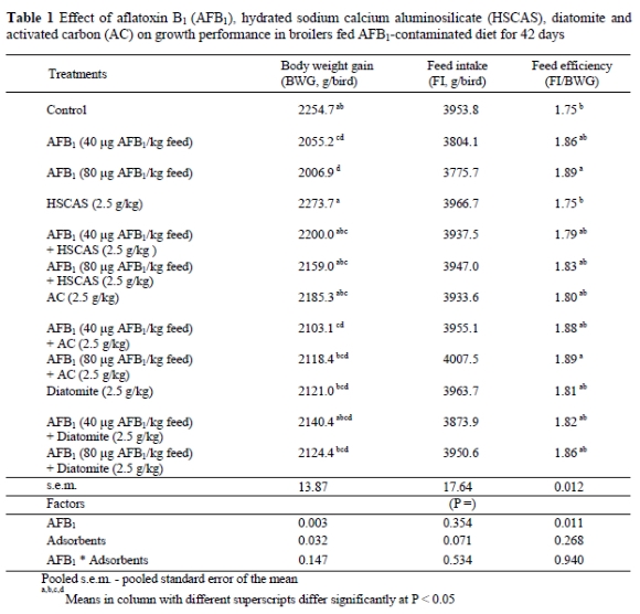 Feed contaminated with anatoxins can cause significant economic losses to the poultry industry due to reduced growth performance and their adverse health effects in the exposed birds. Effects of AFB1 and of the adsorbents HSCAS, diatomite and AC on body weight gain, feed consumption and feed efficiency in broilers exposed AFB1 are presented in Table 1.