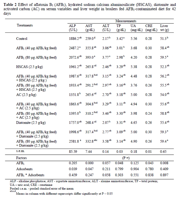 The objective of this study was to compare the protective role of HSCAS, diatomite and AC against AFB1 toxicity in growing broiler chicks by observing their effects on growth parameters and serum biochemical variables.