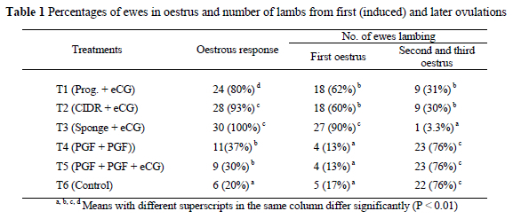 The highest number of ewes that lambed within the 152 ± 7 days to females treated per treatment group (30 ewes) was 27 (90%) for Treatment 3. The lowest number was four (13%) for Treatments 4 and 5. A significant difference (P < 0.01) was observed between treatments for number of ewes lambing. The difference between treatments regarding the number of ewes lambing in the second and third oestrous periods was also significant (P < 0.01). The percentage of infertile (not lambing) ewes in this study ranged between 6.6 to 10% in all treatment groups.
