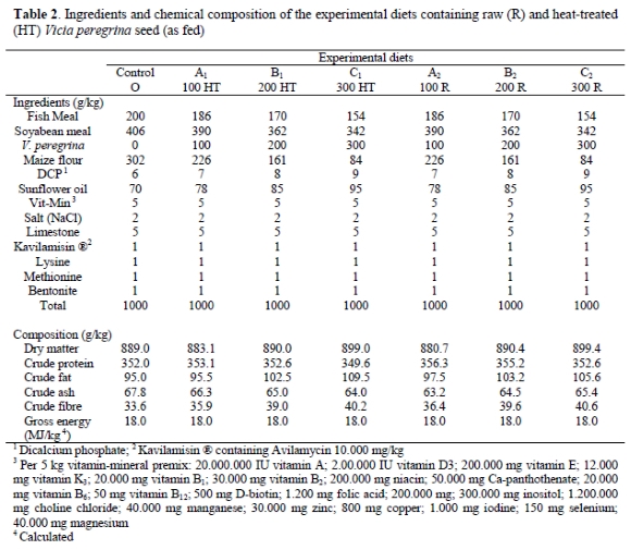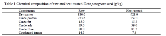 Vicia peregrina seed was sun-dried and ground into a powder to pass through a 1 mm sieve. The ground seed was heat-treated in an autoclave at 121 °C for 10 min (Rehman & Salariya, 2005) to eliminate the possible detrimental effects of anti-nutritional factors. The chemical composition of raw and heat-treated V. peregrina seed is presented in Table 1.
