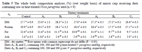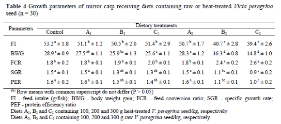Many legume seeds contain lectins. Their biological effects include disruption of small intestinal metabolism and morphological damage to villi. Lectin content of seed can be removed by aqueous heat treatment or autoclaving (Grant, 1991). The heat-treatment employed in this experiment might have limited or reduced the deleterious effect of lectin on the utilization of V. peregrina seed for mirror carp fingerlings.