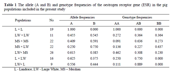 Improvement in reproduction traits of livestock species is limited when using traditional methods of genetic selection because of the low heritability and sex-limited nature of these traits. Marker-assisted selection programs could be included in genetic selection and be very effective in genetic improvement, especially for improvements in reproductive traits. Using the candidate gene approach, the oestrogen receptor (ESR) gene (Rothschild et al., 1994), the follicle stimulating hormone-ß subunit (FSH- ß) gene (Li et al., 1998) and other genes have been shown to be associated with reproductive efficiency in pigs. The ESR gene was the first candidate or major gene studied, and in recent years there are many reports about the ESR locus and its relationship with reproductive traits and some performance traits (Rothschild et al., 1994; Southwood et al., 1995; Short et al., 1997; Southwood et al., 1999; Li et al., 2004). However, little attention has been focused on the relationship between the ESR gene and components of reproductive traits. The objective of the current study was to evaluate the effect of ESR genotype and breed on several of these previously less intensively investigated reproductive traits.