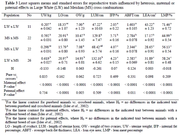 The relationship between an oestrogen receptor (ESR) gene and reproductive traits in 11 Large White (LW), 19 Landrace (L), 22 Meishan (MS), 22 Meishan × Large White (MS x LW) F1, 26 Large White × Meishan (LW × MS) F1, 16 Landrace × Large White (L × LW) F1 and nine Large White × Landrace (LW × L) F1 female populations was studied. Reproductive characteristics and some performance data were analyzed for associations with ESR genotype, parity and breed. The ESR genotype was associated with length of oviduct (LO). Uterine weight (UW), LO and the weight of two ovaries (OW) of purebred Meishan and LW × MS females were higher than those of purebred Large White and MS × LW females. In Large White and Meishan crosses, crossbreds with Meishan dams had higher UW, LO, uterine horn length (LUH) and OW than pigs with Large White dams. Significant effects of paternal breed of sire were observed for LO and OW. In Large White and Landrace combinations, differences in values between purebred and crossbred animals were found for UW and LO. However, maternal breed effects were not detected for UW, LO, LUH, OW. A significant effect of paternal breed of sire was observed for LO. Females with Landrace sires had a larger LO than females with Large White sires.