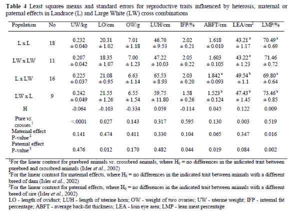 As for the Large White and Landrace crosses, significant differences in values between purebred and crossbred animals were found for UW (P < 0.01), LO (P < 0.05) and LEA (P < 0.01) (Table 4). Maternal breed effects were detected only for LMP (P < 0.05). A significant effect of paternal breed of sire was observed for LO, IFP and LMP (P < 0.05).