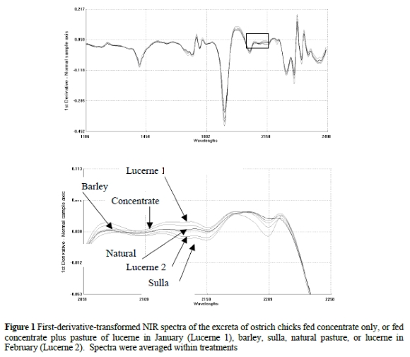 The nutrient composition of diets has been successfully predicted by using faecal NIRS for grazing beef cows (Lyons & Stuth, 1992; Coates, 1999) and goats (Landau et al., 2005). Coates (1999) claimed that not only dietary composition, but also the intake of nutrients can be predicted by means of faecal NIRS in beef cows. No attempts to use faecal NIRS to assess dietary attributes in birds have been reported, maybe because faeces and urine cannot be easily separated, even though, in ostriches, they are voided via distinct ducts and their excretion is not synchronous (Duke et al., 1995). However, the principles of faecal NIRS are empirical, and there is no theoretical reason to think that the chemical information encompassed in a mixture of faeces and urine has less value than that of faeces alone in predicting dietary attributes.