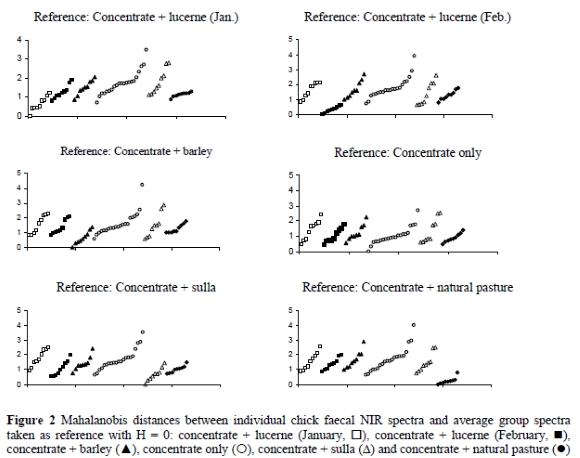 In order to assess whether NIR spectra of excreta can be used in monitoring the feeding management system (i.e. confinement vs. grazing), and whether chicks kept on similar management regimens have excreta of similar spectral characteristics, the Mahalanobis spectral (H) distance was used. The H distance (Naes et al. , 2002) was calculated between individual spectra and a population centroid by using an average computed spectrum according to the score routine of Winisi II that is based on six best components in principal component analysis (PCA; ISI, 1999).