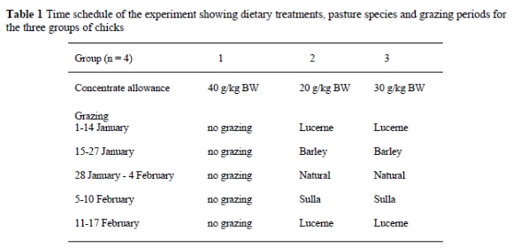 Twelve 8-week-old ostrich chicks, averaging 21.9 (s.e. 0.55) kg were housed in individual pens measuring 2.4 x 1.2 m. The first 16 days were an adaptation period when all chicks received a commercial concentrate (Nir Oz, Israel) at 30 g/kg (days 1 - 8) and 40 g/kg (days 9 - 16), based on group average body weight (BW). Thereafter, chicks were allotted to one of three groups and stayed in the same group throughout the experiment. Group 1 was fed on concentrates only, provided at 40 g/kg BW (n = 4); groups 2 and 3 were fed concentrate, provided at 20 (n = 4) and 30 (n = 4) g/kg BW, respectively, and also grazed for 4-6 h daily as one flock (Table 1). Concentrate allowance was adjusted weekly on the basis of individual BW.