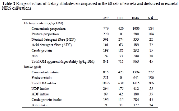Using sets of individual excretal samples and data for intake and diet quality, the potential of NIRS of excreta to predict the dietary proportion of concentrate or pasture and contents of crude protein (CP), ash, neutral (NDF) and acid detergent fibre (ADF), and apparent total organic matter digestibility (TOMD) was evaluated.
