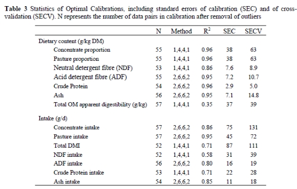 Optimal calibrations are shown in Table 3. The NIRS equations enabled attribution of 96% of the variation of dietary concentrate proportion, ranging from 420 to 1000 g/kg of DM, with accuracy (SECV) of ±63 g/kg. Similar R2 values were clearly noted for the pasture proportion of the diet, and also for the dietary contents of CP, ADF and ash; R2 for the prediction of NDF content was lower (0.86). Dietary contents of ash, CP, NDF and ADF were predicted with SECVs of 14.8, 5.0, 8.9, and 10.7 g/kg DM, respectively. The calibration for apparent TOMD was of poor quality, with low R2 (0.35) and high SECV. Therefore, no attempt was made to calibrate equations for the intake of organic matter digested. Good (R2 = 0.95) and acceptable (R2 = 0.86) calibrations were obtained for the intakes of pasture and concentrate, with respective SECVs of 75 and 131 g/d, respectively. Lower R2 values were found for the prediction of ash (R2 = 0.85, SECV = 18 g/d) and ADF (R2 = 0.80, SECV = 19 g/d) intakes. The calibrations of CP and NDF intakes were even poorer, with R2 = 0.71 and 0.58, respectively, and SECVs of 28 and 39 g/d, respectively.