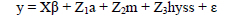 where y = vector of observations, ß = vector of fixed effects influencing the trait, a = vector of direct genetic effects, m = vector of random maternal genetic effects, hyss = vector of additional random effects of herd-year-season x sire interaction, X, Z1, Z2, and Z3 are incidence matrices relating observations to their respective fixed and random effects and 8 = is a vector of residuals. The covariance between direct and maternal genetic effects was included in the covariance matrix for the random effects (a and m). The vector of fixed effects included sex, herd-year-season, management group, age of the calf, age of the dam and animal and maternal inbreeding by considering linear effects in the same model.