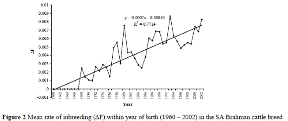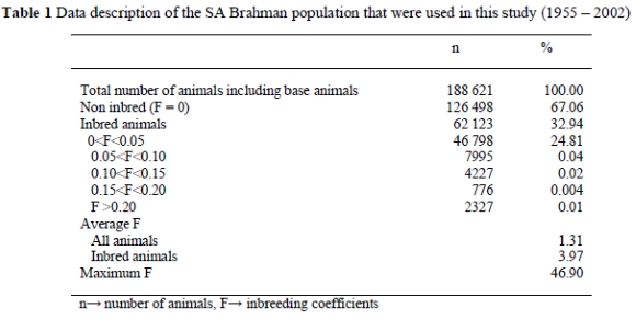 Maintaining genetic variation within a breed is important to ensure that future animals can respond to selection and changes in the environment. Without genetic variation, animals cannot adapt to these changes (Tseveenjav et al., 2001). In order to understand the impact of inbreeding on populations, several studies have been focused on the levels of inbreeding and their effect on phenotypic values in various populations: Nomura et al. (2001) in Japanese Black cattle, Fioretti et al. (2002) in Piedmontese cattle and Weigel (2001) in dairy cattle to mention a few. In the South African Brahman cattle breed the question might arise as to what level inbreeding has accumulated. The main objective of the study was to obtain insight into the current status of inbreeding in the South African Brahman cattle breed