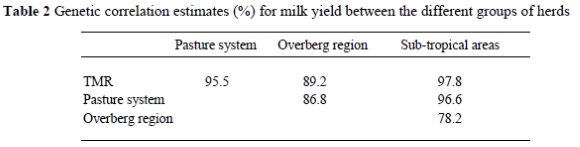 The genetic correlations between the different groups according to feeding and geographical location are presented in Table 2. All correlations were highly significant. The highest correlation (97.8) was estimated between the TMR herds and the herds in warmer sub-tropical areas of the country. A possible reason for this high correlation is that all the herds in the sub-tropical areas parts are on a TMR system. The bulk of these herds have also put certain measurements in place to try to control the effect of the extreme heat.