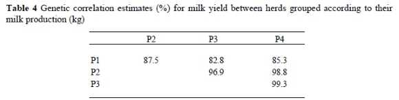 The low producing group (P1 < 4000-Table 4) had the lowest correlation with all the other groups in the analysis where production was used as criteria. The lowest correlation estimate was obtained between the low producing herds (P1) and high producing herds (P3 and P4), while the highest correlation estimate was obtained between the herds grouped in the two high producing groups. The main difference is that all the low producing herds were pasture based and that feeding in the other three groups varied between TMR and pastures, with a combination between the two in some instances. Again all correlations were significant.