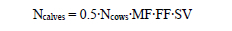 Cow weights taken at calving and weaning were averaged to derive the value of cow weight (CW) used in this study. Weaning weight (W) was assumed to be affected by direct and maternal effects in the manner of an arbitrary base value (200 kg) multiplied by (1 + d + m), where d and m are proportional value for direct and maternal effects. Breed-specific values of d and m were derived by solving W = 200(1 + d + m) and D = 200(d - m) simultaneously, where D is the 1997 difference in direct and maternal EBV for weaning weight from the national genetic evaluation system as presented by Bergh & Gerhard (1999). Milk production of breed i was assumed proportional to mi and based on milk production of Hereford (H) cows (1062 kg/lactation) from MacNeil & Mott (2000); Thus, for the i'th maternal breed MMi = 1062(1 + (mi -mH)/0.5). Therefore, the number of cows in production was: