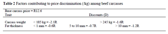 Phenotypes of individual animals were simulated at harvest. Initially, samples were drawn from a bivariate (r = 0.315) normal distribution for fat depth (SD = 0.46 mm) and carcass weight (SD = 13 kg). Samples from the bivariate normal distribution resulting in a predicted fat depth less than 0.01 mm were discarded. In setting up the base simulations for each breed combination, DF was optimized to minimize the number of animals that would have carcass weights less than 185 kg or greater than 245 kg and fat depths less than 1.0 mm or greater than 5.0 mm. This parameterization assumes animals were managed as a group rather than as individuals and resulted in simulations for each breed combination that minimized the number of animals in the group that were subject to discounts in price per kg carcass. Carcasses were valued relative to a base price of 12.6 R/kg (Germishuis, 2004) with price discrimination factors shown in Table 2. Thus, income (I) derived from each simulated calf was: