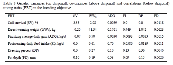 Specialized sire breed candidates for selection could be ranked using the sum of the products of the appropriate relative economic values derived here and the corresponding breeding values. When breeding values are not available for some economically important traits extension of the breeding objective to include genetic evaluations for indicator traits is straightforward, given appropriate estimates of genetic variances and covariances (Schneeberger et al., 1992).