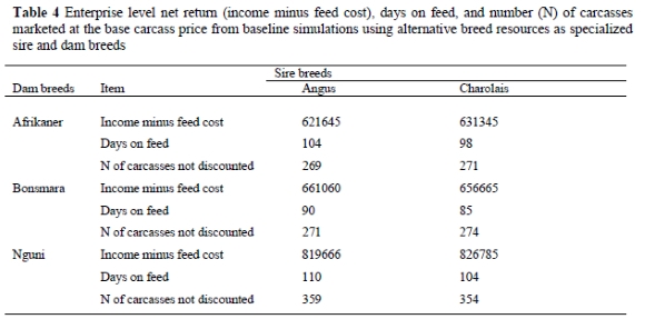 The perspective taken here is that of a domestic commercial production unit that utilizes a fixed natural resource base for cow-calf production and markets calves produced based on their carcass merit. This approach conceptually allows feed resources to be carried over from a season when there is a surplus to a season when there is a deficit relative to the requirements of the cow-herd. However, it does not allow for importation of feed from outside the system. While it was not the goal of this research to contrast differences in the use of breed resources, it is useful to recognize production system level differences in considering the relative economic values. Differences in cow weight and milk production influence the scale of the enterprise, but are unaffected by the use of the specialized sire breed. Thus, progeny from 1007 Afrikaner, 919 Bonsmara, and 1242 Nguni cows were simulated and numbers of progeny sired by the specialized sire breed were 274, 279, and 382, respectively. Numbers of progeny sired by the specialized sire breeds accounted for breeding 50% of females to maternal breed bulls for generating replacement females as well as effects of male and female fertility and calf survival. Whether breeding 50% of females to terminal sires can be sustained depends on criteria used for culling cows and their survival rate in the system. However, if all females that failed to become pregnant annually were culled, then a terminal sire system may not be viable. Our perception is that this level of managerial intervention is not presently in place. Results from the baseline economic analysis of the feedlot phase are presented in Table 4. The general advantage in income minus feed cost of the Nguni dam breed, irrespective of sire breed, is approximately consistent with differences in herd efficiency reported by Du Plessis et al. (2006). However, the simulated difference between Afrikaner and Bosmara dam breeds in income minus feed cost was smaller than the corresponding difference in herd efficiency observed by Du Plessis et al. (2006).