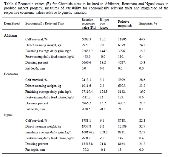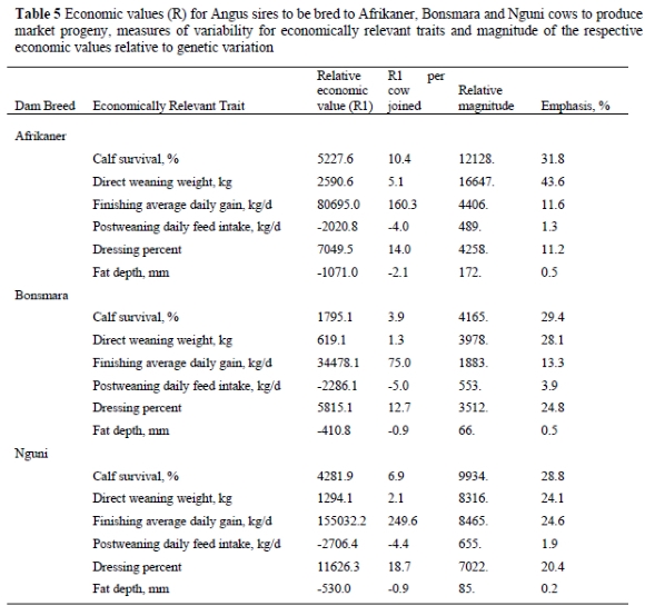 Presented in Table 5 are relative economic values for Angus bulls used as specialized sire breed on Afrikaner, Bonsmara, and Nguni females. Corresponding results for Charolais are presented in Table 6. The relatively subtle differences among objectives result from phenotypic differences between breeds. We reiterate the comment of Du Toit et al. (1995) that better characterization of breeds for economically relevant traits would be of considerable value; not only to this research but also to appropriate breed use throughout South Africa. Genetic correlations among the six breeding objectives were all greater than 0.9. Thus, discussion herein is limited to generalities apparent across the breed combinations. This result also suggests breeders need not consider breed of dam in evaluating Angus or Charolais bulls to use in producing top-cross progenies for the feedlot market.