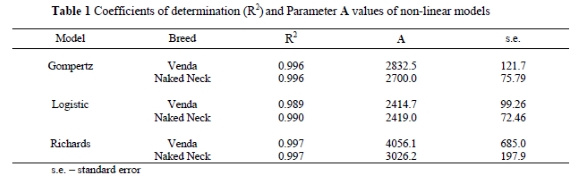 Based upon the decision of the choice of the most appropriate model, differences between the growth parameters of the breeds were tested using the t test procedures. The A model parameters (and standard errors) and Coefficients of determination (R2) estimated from different models are presented in Table 1.