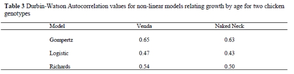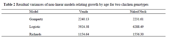 The residual variances were larger for the Logistic growth model than the Gompertz and Richards models. The Richards model had the smallest residual variances. This was observed for both breeds. Yakupoglu & Atil (2001) found lower residual variances for the Gompertz model compared to the Bertalanffy. In a study by Sengul & Kiraz (2005) the lowest residual variances were found under the MMF model followed by Gompertz, Logistic and Richards models, respectively. On the basis of residual variances in the present study, the Richards and Gompertz models seem to be the most appropriate models for explaining of the growth of indigenous chickens.
