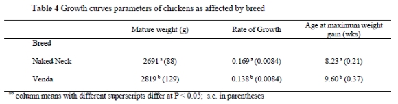 There were differences in all growth parameters indicating differences in growth of the two breeds. The Naked Neck had a higher growth rate, reached maturity earlier but had a lighter mature weight. On the other hand, the Venda breed was late maturing but heavier at maturity. Some study (unpublished) carried out at the Animal Improvement Institute of the Agricultural Research Council (ARC) showed the Venda breed attaining sexual maturity at 143 days of age, reaching a weight of 2.01 kg at 20 weeks, while the Naked Neck breed reached a weight of 1.95 kg at 20 weeks and attained sexual maturity at 155 days.