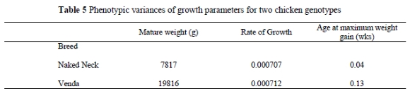 The phenotypic variances were larger for mature weight and age at maximum gain in the Venda breed than in the Naked Neck while the variances for rate of growth were similar in the two breeds. This indicates that there is larger variation in mature weight and age at maximum weight gain in the Venda than in the Naked Neck chickens. Given the fact that the two breeds were raised under similar conditions, it can be assumed that there is a higher genetic variation for mature weight and age at maximum weight gain in the Venda than in the Naked Neck chicken. This suggests that there is a larger scope for rapid genetic improvement of mature weight through selection in the Venda breed than in the Naked Neck.