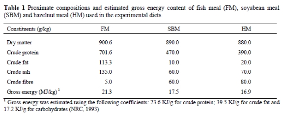 Hazelnut meal (HM) resulting from the solvent extraction of hazelnut oil is readily available (Yalcin et al., 2005). Although HM was evaluated for rainbow trout by Bilge (2006), so far there have been no published studies on the use of HM as a protein resource in mirror carp (Cyprinus carpio L) diets. The objective of the present study was to evaluate the effects of replacing the protein supplied by FM or soyabean meal with HM on the growth parameters and body composition of mirror carp fingerlings cultured under laboratory conditions.