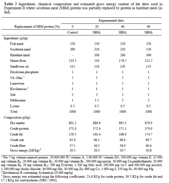 In Experiment II four isonitrogenous, isoenergetic diets were also formulated to evaluate the nutritional value of HM replacing the protein in SBM in the diets of carp fingerlings. Details of ingredients and proximate composition of the diets used for the second trial are given in Table 3. The method of preparation of the diets was similar to that adopted in Experiment I. The control diet contained 250 g FM/kg and 390 g SBM/kg as main protein sources. Hazelnut meal was tested at three inclusion levels (20, 40 and 60% replacement of SBM protein) by reducing SBM levels (Table 3).