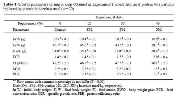 An 80-day feeding trial was conducted as two experiments to evaluate the effects of replacement of fish meal (FM) and soyabean meal (SBM) protein with hazelnut meal (HM) protein in the diets of mirror carp (Cyprinus carpio) fingerlings. Growth parameters and body composition were measured in fingerlings cultured under laboratory conditions in a recirculation system aquarium at 26 ± 0.3 °C. In Experiment I four isonitrogenous, isoenergetic diets were formulated by replacing 0, 25, 35 and 45% of protein from FM by HM. Fingerlings receiving the diets in which 0, 25 and 35% of the FM protein were replaced, had similar body weights, specific growth ratios (SGR), protein efficiency ratios (PER) and feed conversion ratios (FCR). In Experiment II four isonitrogenous, isoenergetic diets were formulated by replacing 0, 20, 40 and 60% of protein in SBM with HM. Fingerlings receiving the diets where 0, 20 and 40% of the SBM protein were replaced, had similar body weights, SGR, PER and FCR. However, fingerlings consuming the highest dietary inclusion level of HM (60% replacement) had significantly lower responses for all the above parameters than fingerlings receiving the other diets. The fat content of fingerlings fed diet FM3 where 45 % of FM protein was replaced by HM protein, was significantly lower than those on the other diets. It was concluded that HM could replace up to 35% of the protein in FM and 40% of protein supplied by SBM in fingerling carp diets without adverse effects on growth, FCR, PER, FI, BWG and body composition.