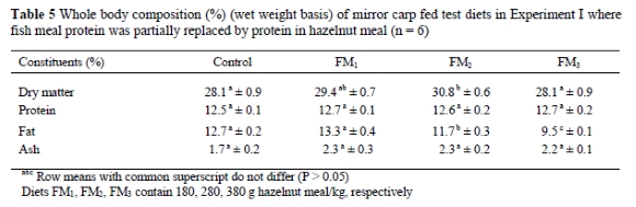 The effect of diets on whole body composition of mirror carp fingerlings at the end of the feeding Experiment I is given in Table 5. Fish fed on the Control and FM1 diets had a similar fat content. However, fish fed on diets FM2 and FM3 had a significantly lower fat content than those on the other diets.