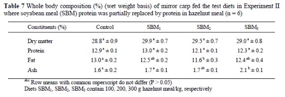 The effect of diets on whole body composition of the mirror carp fingerlings at the end of the feeding Experiment II is given in Table 7. Fish fed on the Control and SBM1 diets had a similar fat content. However, fish receiving the diet SBM2 had a significantly lower fat content than those fed the Control diet.