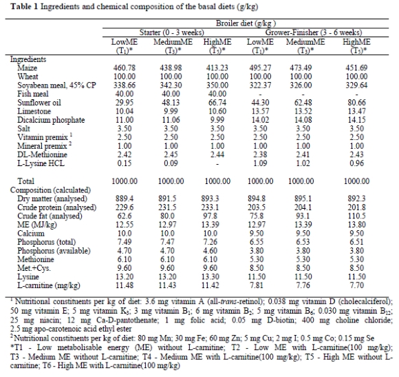 The experiment was conducted using a 3 x 2 factorial design with three levels of metabolisable energy (ME) (12.55, 12.97 and 13.39 MJ/kg for starter diets; 12.97, 13.39 and 13.80 MJ /kg for grower diets) and two levels of dietary L-carnitine (0 and 100 mg/kg in both starter and grower diets) in the form of Carniking® (LONZA Ltd., Basel, Switzerland). L-carnitine was incorporated into the diets by replacing maize. Ingredients and the chemical composition of the basal diets are presented in Table 1. The diets consisted of maize, wheat, soyabean meal, fish meal, sunflower oil and DL-methionine and L-lysine HCL crystalline amino acids. The diets were formulated to be lower, to meet or to exceed NRC (1994) recommendations for broiler chickens. The low, medium and high ME diets had identical levels of crude protein (CP) (230 and 200 g/kg for starter and grower diets, respectively). Prior to the formulation of the experimental diet, feed ingredients were analyzed for their DM, CP, crude fat (CF), starch and total sugar content, according to AOAC methods (1984). The ME of feed ingredients was calculated based on analyzed values of the feedstuffs (WPSA, 1989). The L-carnitine content of these basal diets was calculated based on the L-carnitine concentrations in the ingredients used (Harmeyer et al., 1998).