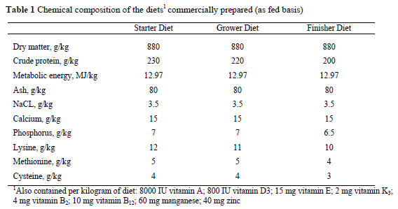 Diets were isoenergetic and isonitrogenous. The birds were allowed ad libitum access to feed and water and maintained on a 24-hour constant lighting program. When chicks reached an age of 22 days, water was withdrawn for two hours before vaccination to allow them to get thirsty. Broiler chicks were vaccinated with La Sota vaccine (Intervet International B.V. Boxmeer, Holland) reconstituted with unchlorinated water. Ample water space was provided so that all birds could get water easily. Body weights of broiler chicks were recorded weekly and mortality in the groups was recorded daily. At the end of the study the chickens were slaughtered and carcass weight and the weights of some organs (liver, heart, gizzard and intestine) were recorded. In this study, data on broiler performance and organ weights were analyzed using the general linear models procedure and differences were considered significant at a level of 95% (SPSS software 10.0; Chicago, IL). The significance of the differences among the groups has been determined by Duncan's range test (SPSS software 10.0; Chicago, IL).