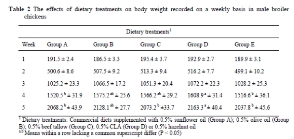 Four hundred 1-day old Ross PM3 broiler chicks were obtained from a commercial hatchery and were housed in a room with 24-hour constant fluorescent lighting. They were vaccinated against Newcastle disease (HB1) in the hatchery. At the end of one week of feeding, sexes of the broiler chicks were determined. In this study, male broiler chicks were used because uniformity of birds is really important in an experiment. As known, body weights of the male and female birds are pretty similar at the beginning of the hatch. However, there would be a great difference in the body weights between male and female chicks at the end of 6-weeks feeding. For this reason, only male chicks were used to get better uniformity in the study. One hundred and seventy five 1-week old Ross PM3 male chicks were randomly allocated to five dietary groups (n = 35) and fed a commercially prepared diet supplemented with 0.5% sunflower oil (Group A), 0.5% olive oil (Group B), 0.5% beef tallow (Group C), 0.5% CLA (Group D) or 0.5% hazelnut oil (Group E) for five weeks. The objective of the study was to determine the effect of different oils containing markedly different fatty acids and CLA on growth performance of the broilers vaccinated with Newcastle La Sota vaccine. Individual fatty acids have different properties due to the number and configuration of double bonds in the chain. In the current study the oils chosen represent different groups of fatty acids. For example, sunflower oil contains 69% linoleic acid; olive oil contains about 72% oleic acid and beef tallow contains higher levels of saturated fatty acids (mainly C14:0, C16:0 and C18:0). The source of CLA-80 consisted of 35.33% c-9, t-11 and t-9, c-11-CLA, 35.72% t-10, c-12-CLA; 1.11% c-9, c-11-CLA; 1.57% c-10, c-12-CLA; 0.91% t, t-9, 11 and 10, 12-CLA. Other fatty acids in CLA were 6.64% palmitate, 2.39% stearate, 13.77% oleate, and 0.81% linoleate, and 1.75% unknown. Oils and CLA were mixed into the diets later.