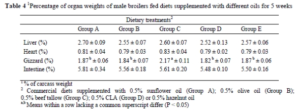 The effects of dietary treatments on the percentage of organ weights of male broilers are presented in the Table 4. No significant differences in the proportions of liver, heart and intestines of the male broilers were observed among the groups. However, the proportion of the gizzard was found to be higher (P < 0.05) for males from Group C.