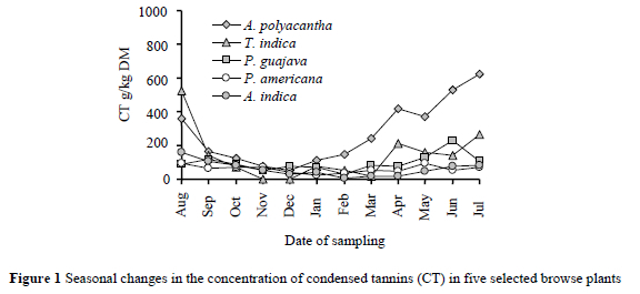Seasonal variation in the concentration of CT in leaves of the five selected browse species is shown in Figure 1. Variations in CT levels in the plants followed a characteristic pattern that was similar for all species. The lowest concentration of CT was recorded for samples collected in November to February. The values increased gradually to a peak in July before declining gradually towards November.